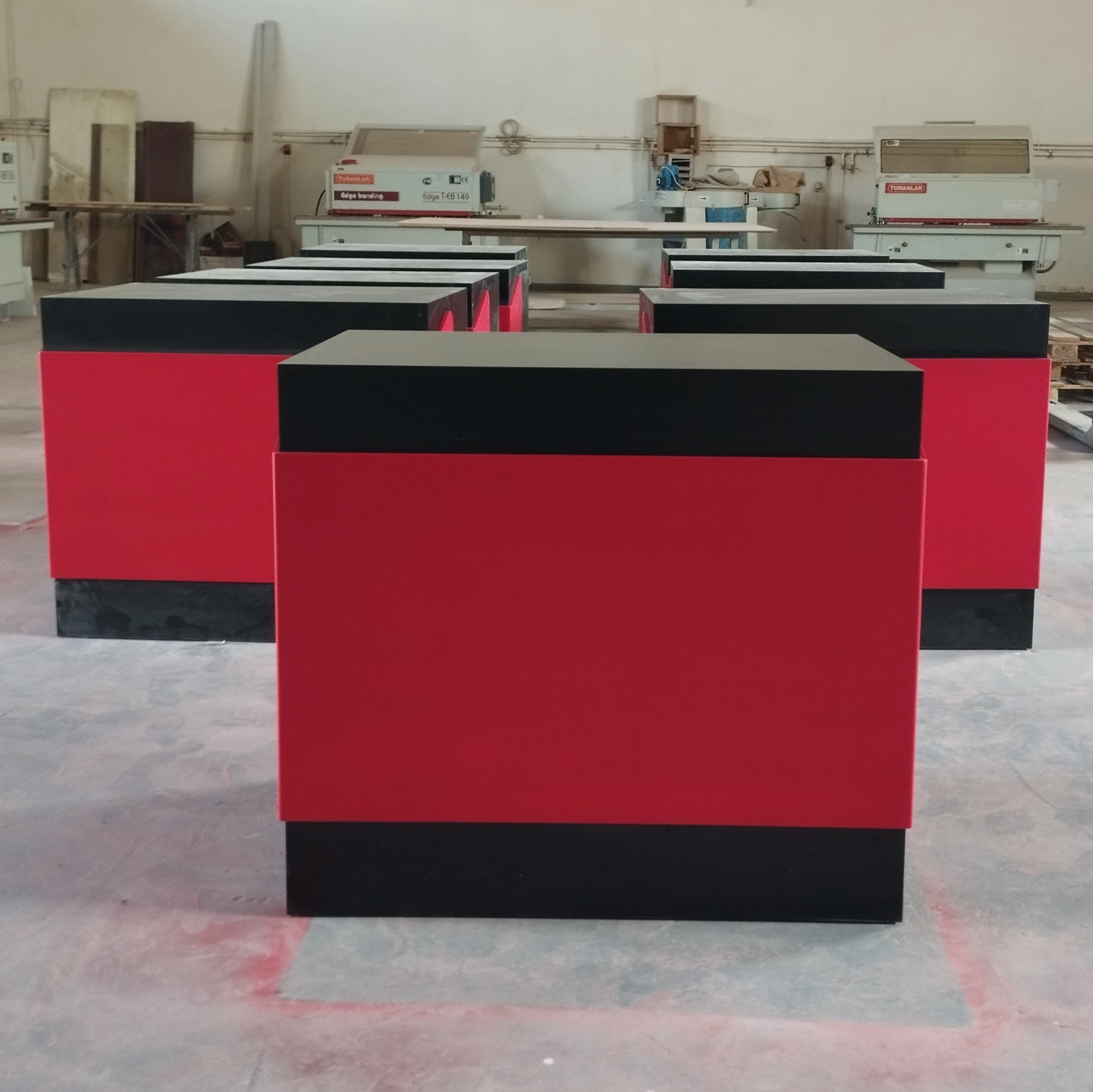 Столы были изготовлены из LMDF и MDF, окрашенных без использования ПВХ, с использованием метода резки под углом 45 градусов, акриловое стекло было брендировано лазерной резкой.