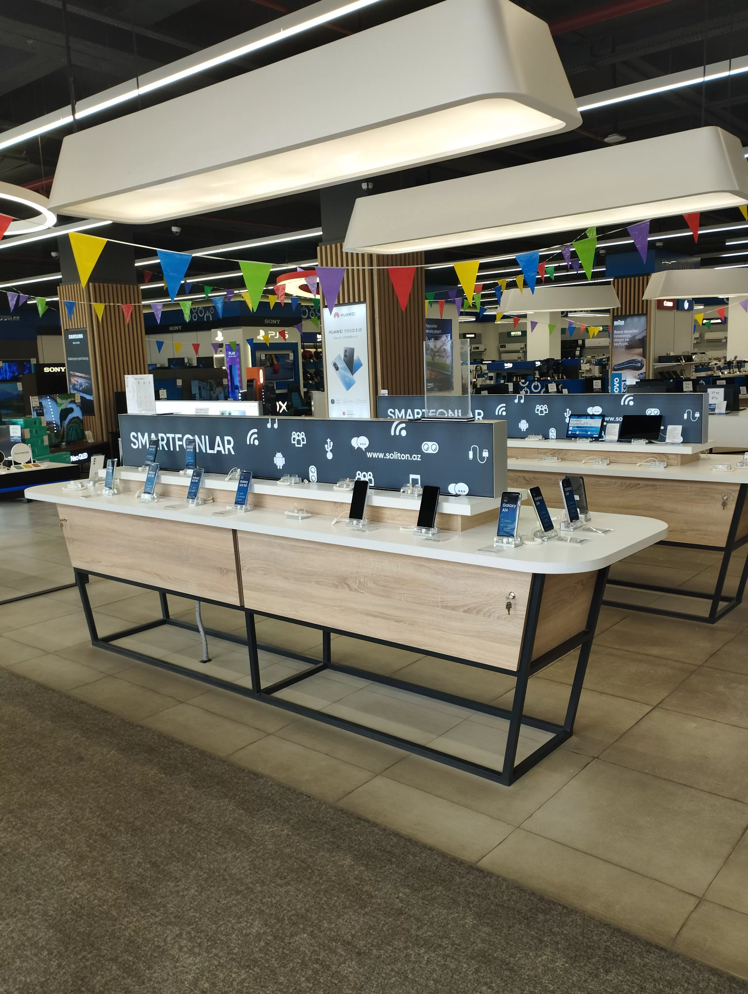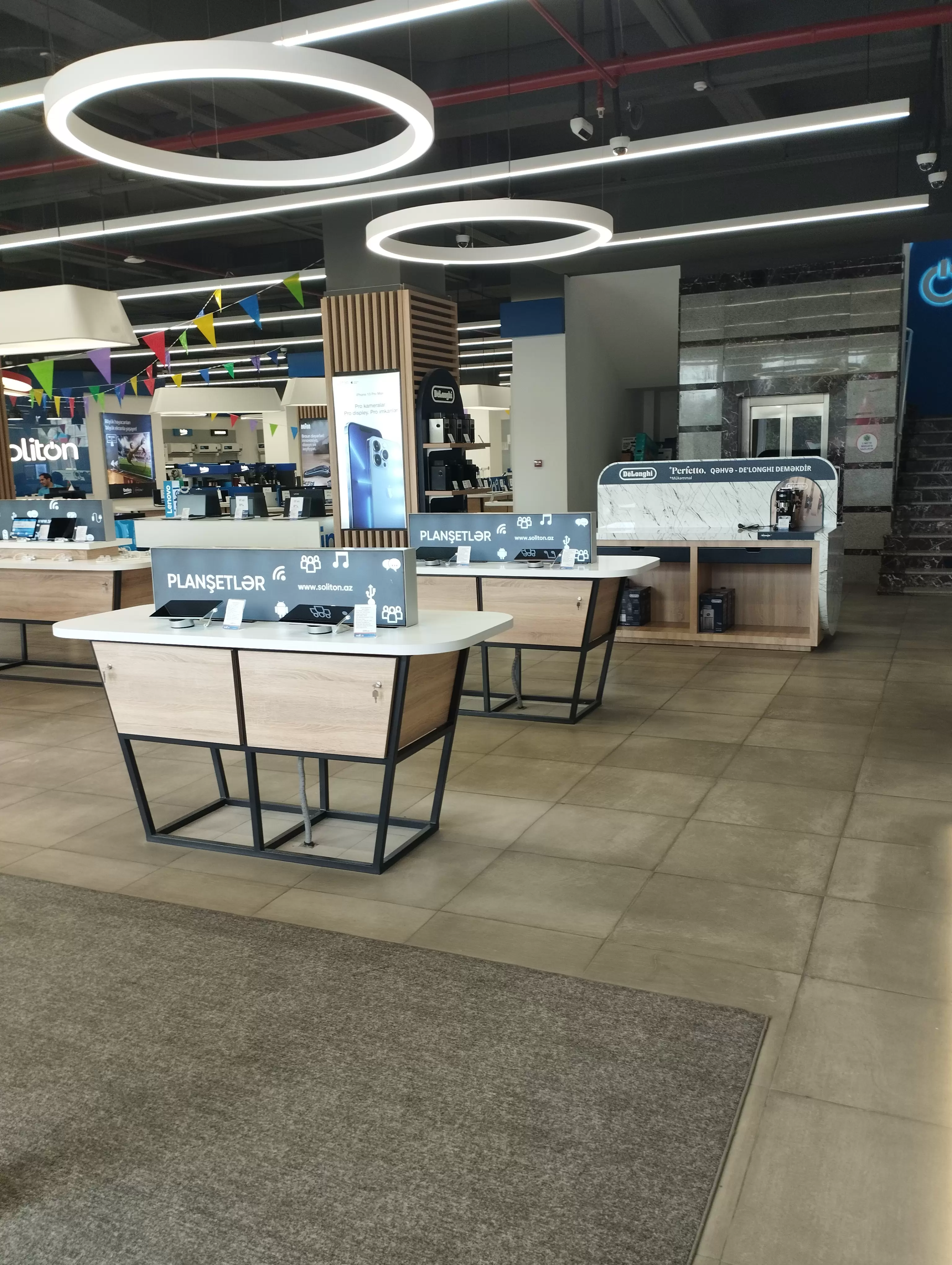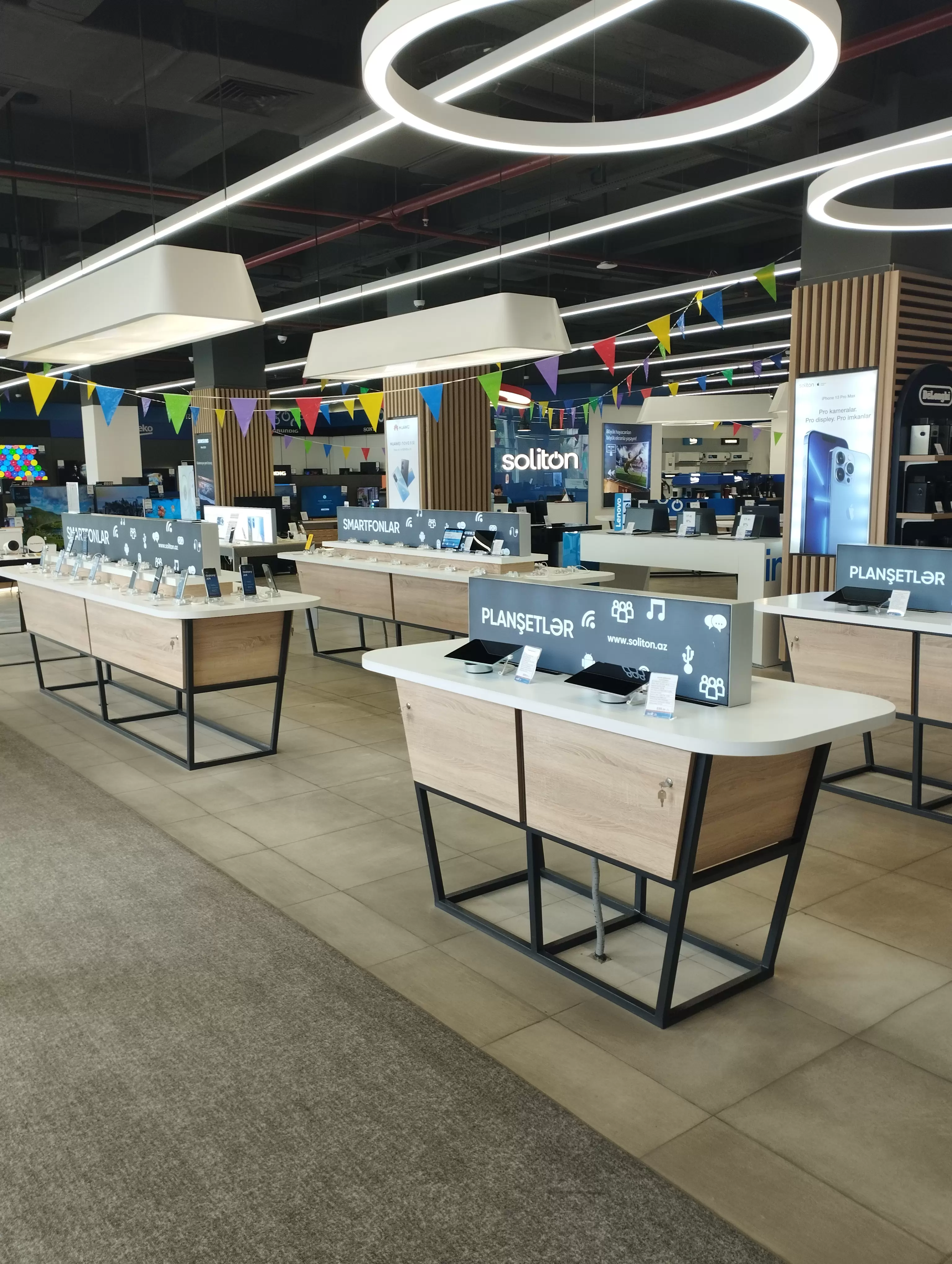 На основе нашего сотрудничества с Soliton, которая является одной из крупнейших компаний в стране по продаже электронной продукции, мы выполнили работы по проектированию, производству и монтажу их магазина Sumgait Flagman, который является крупнейшим магазином в компания. 850 кв.м. площадь была завершена и полностью сдана в короткие сроки. В магазине есть разнообразные товарные стенды, витрины, стойки регистрации, стеклянные стойки ресепшн, внутренняя реклама (объемные буквы, световые рекламные короба с текстильной печатью), потолочный масштабный логотип, системы освещения и специально разработанное потолочное освещение. зонты и др. производство и монтаж изделий осуществлялись нами. При производстве использовалась сварка металла, ламинированная плита МДФ, окрашенный МДФ, световые системы, привезенные специально из Турции, рекламные короба из профильных систем и т.д.